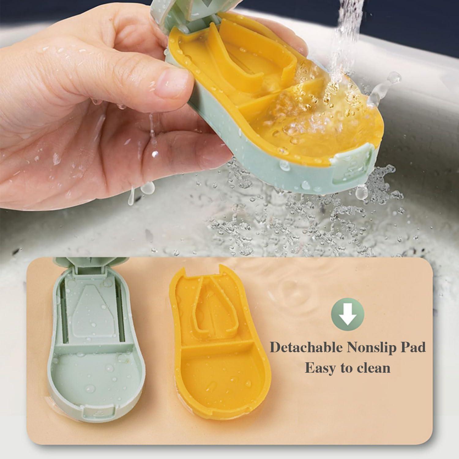 Pill Cutter Splitter for Small and Tiny Pills – Pill Cutter 1/4 – Accurately Cuts Multiple Pills – Easy Open Snap Button. Detachable Nonslip V-Shaped Pad. Wrap-Around Blade Guard. Back Storage (Cyan)(Beige)